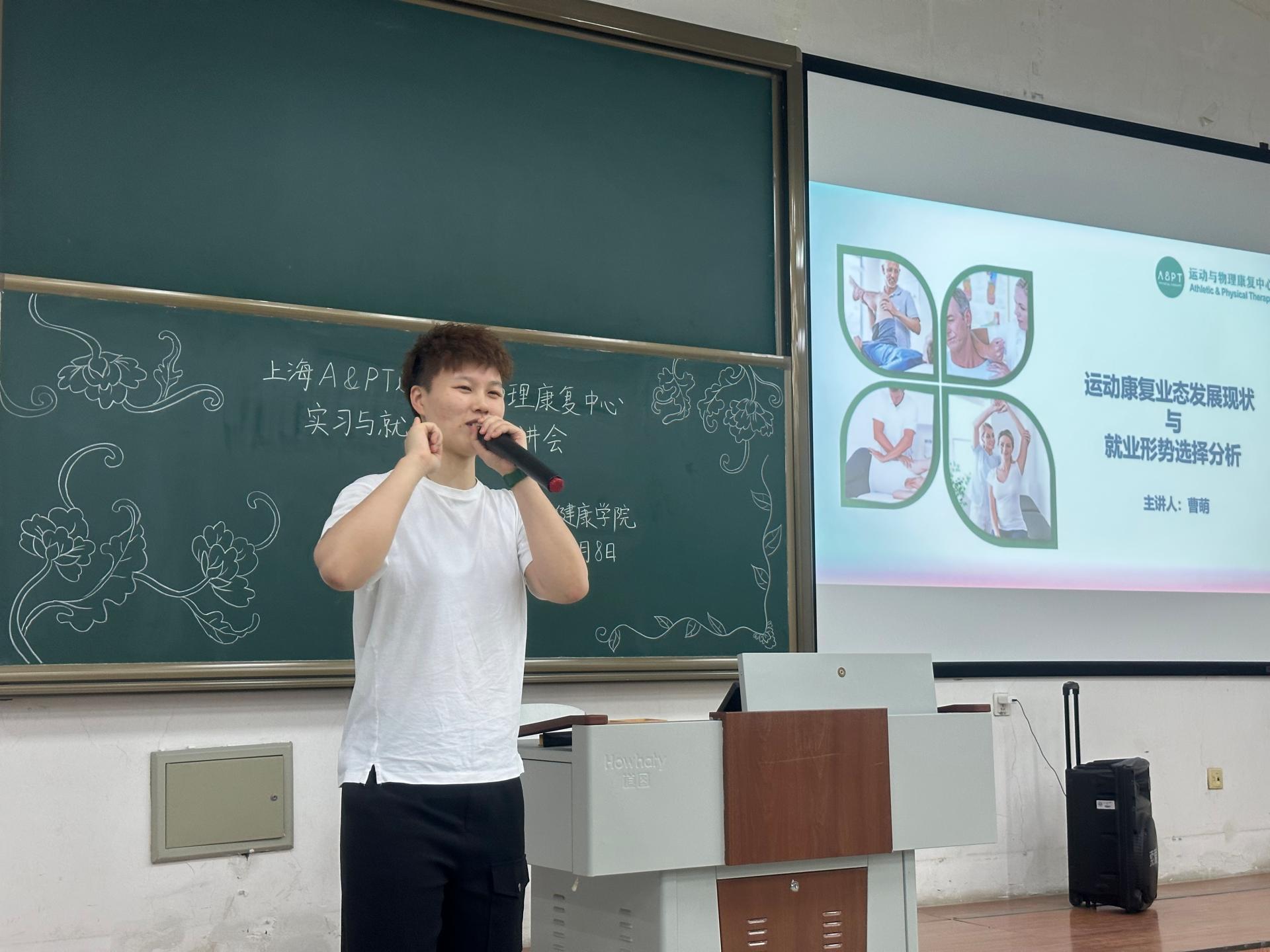 宣讲会上,曹萌总监对国内运动康复行业的市场现状、发展趋势以及主要用户群体进行了分析,并结合案例为全体学生就治疗运动损伤、矫正歪斜体态、改善慢性疼痛、促进骨科术后恢复等方面进