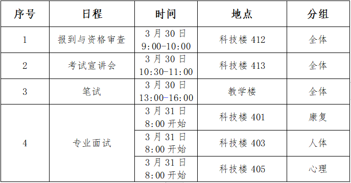 3.候考:考生在专用候考室有序候考,康复组在科技楼413教室,人体组、心理组在科技楼412教室。