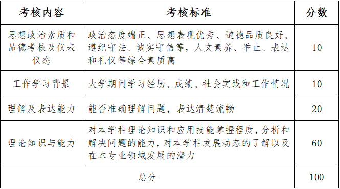 综合面试时间原则上为20分钟。如考生在规定时间内回答完毕,认为不必要再进行回答,可向考官报告“回答完毕”;如考生回答问题超过规定时间上限,经提醒后,考官有权结束面试。满分100分,复试小组专家现场独立评分,取中间分,现场公布成绩,考生现场确认成绩。