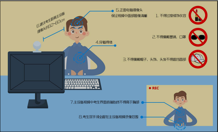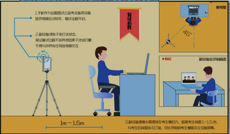 摄像头需摆放在考生侧后方,建议距离考生背面约1米,与考生后背面成45度角,可以录制到考生侧面及一机位屏幕。